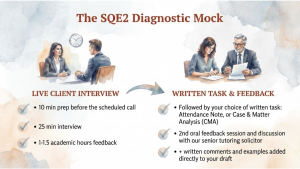 One of the most effective ways to prepare for the SQE2 exam is to start with a diagnostic SQE-2 Mock – a simulated practice session that reveals exactly where you stand. Our diagnostic SQE-2 Mock station is designed to mimic the real assessment as closely as possible, offering a realistic experience of the pressure and structure of the exam. You’ll receive expert feedback that helps you pinpoint your strengths and weaknesses, and develop a targeted strategy for improvement.